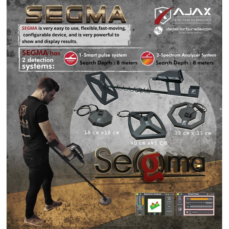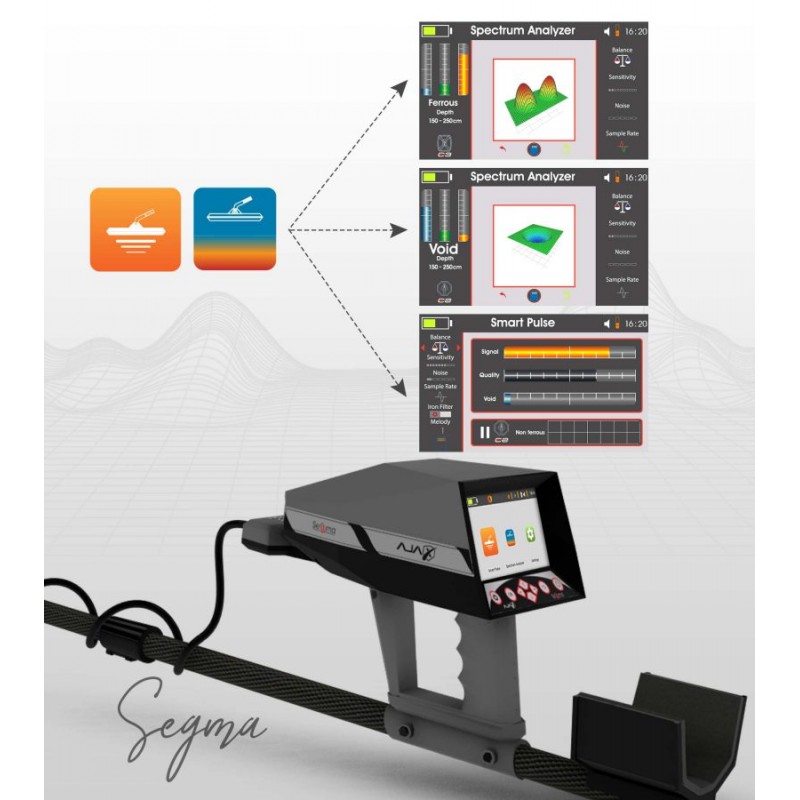 - SEGMA, olağanüstü fonksiyonlara sahiptir. Hedefin 3D görüntüsüyle hedefleri doğrulayabilen ve ortaya çıkaran gelişmiş tespit sistemleriyle yeraltındaki metalleri güvenli bir şekilde tespit etmede mükemmel yeteneklere sahiptir.